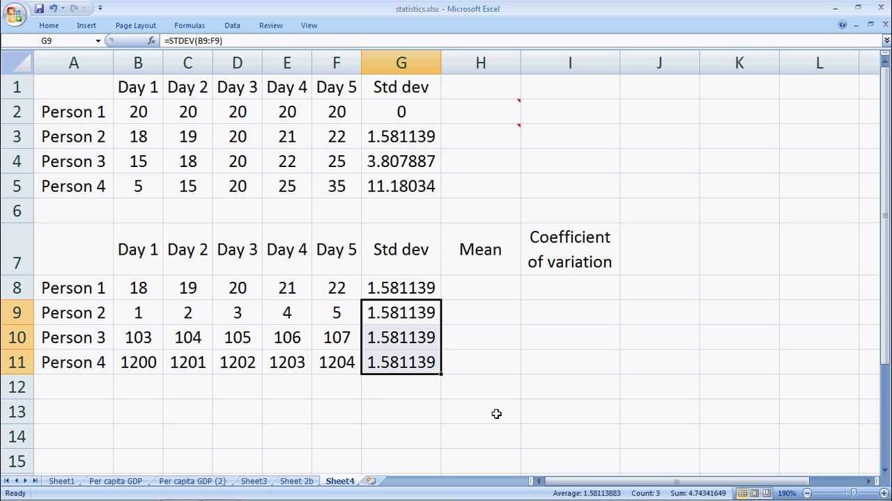 We have seen elementary examples to explain the concept of coefficient of variation. However, in reality, you will never come across such simple calculations. Therefore, one should know how to use MS Excel to determine the formula of the coefficient of variation.